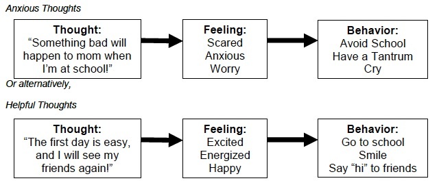 It is important for children to identify their self-talk, because anxious thoughts lead to anxious feelings, which lead to anxious behavior. For example: